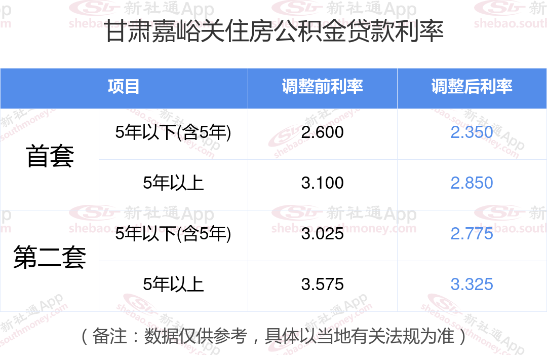 最新央行下调个人住房公积金贷款利率,首套和二套房利率分别调整为2.350%、2.850%和不低于2.775%、3.325%,自2024年5月18日起执行。多地跟进调整,具体可查询当地公积金官网。那现在甘肃嘉峪关住房公积金贷款利率调整后是多少?甘肃嘉峪关个人住房贷款利率最低是多少?下面是新社通APP小编整理的相关住房公积金贷款利率及计算方法的知识,快收藏好了!