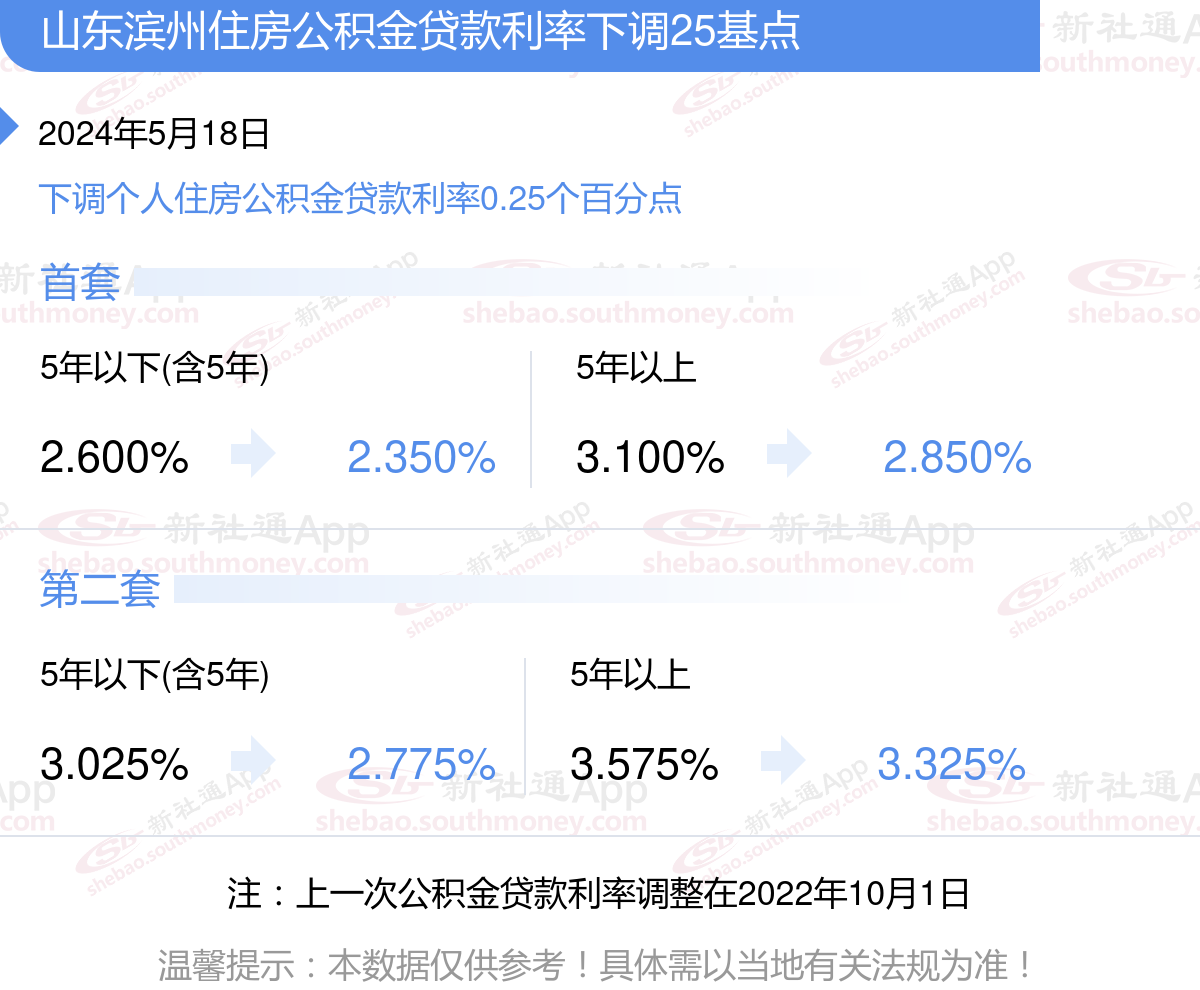山东滨州调整2024年住房公积金贷款利率标准及执行时间一、自2024年5月18日起,下调首套个人住房公积金贷款利率0.25个百分点,即五年以下(含五年)首套个人住房公积金贷款利率由2.600%下调至2.350%,五年以上首套个人住房公积金贷款利率由3.100%下调至2.850%。