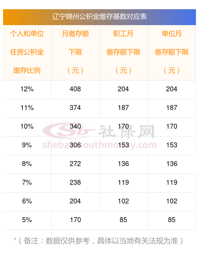 比如辽宁锦州缴纳公积金不同比例金额一览: