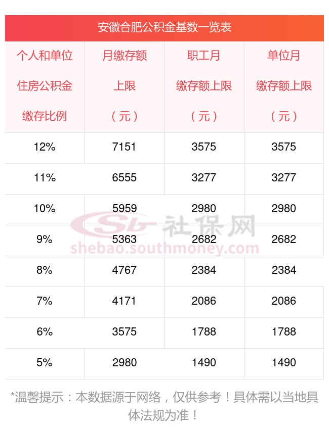 以下举例,可以从安徽合肥不同比例计算得知公积金每月缴存额度的。
