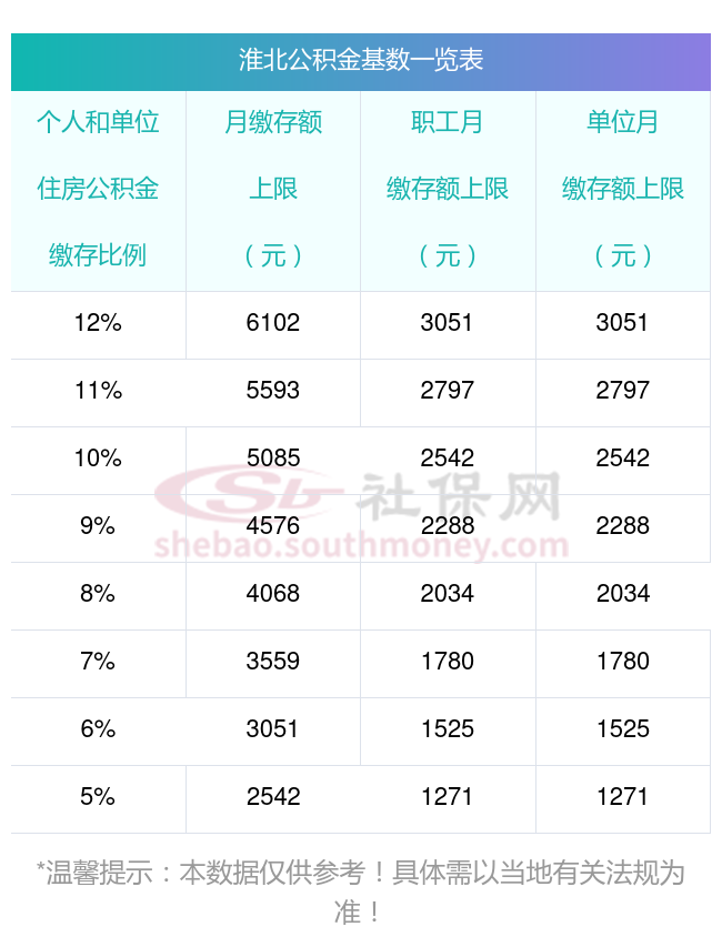 比如淮北缴纳公积金不同比例金额一览: