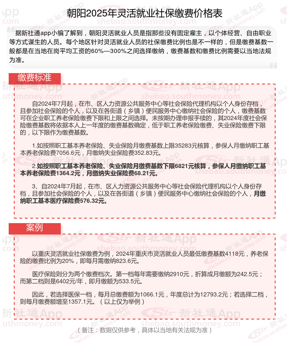 灵活就业社保能抵御疾病、失业、养老等重大风险,避免陷入经济困境。也能享受医保报销、养老金增长等红利。社保是劳动者的法定权利,断缴可能影响购房、落户、子女教育等。接下来随社保君了解一下2025年朝阳灵活就业人员社保交多少钱,2025年朝阳灵活就业社保缴费标准的详细内容。