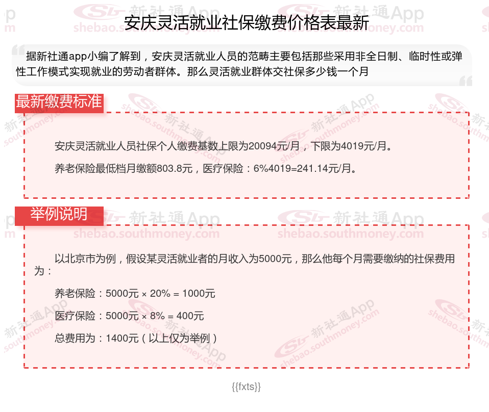 2025年安庆灵活就业人员社保需要交多少钱?灵活就业,作为一种非传统的就业方式,近年来蓬勃发展。为保护这部分人群的权益,国制定了相应的社保缴费法规。2024年,灵活就业社保缴费法规继续完善,涵盖了养老保险、医疗保险、失业保险等多个方面,旨在为灵活就业人员提供全面的社会保证。接下来随新社通APP小编一起来看看。