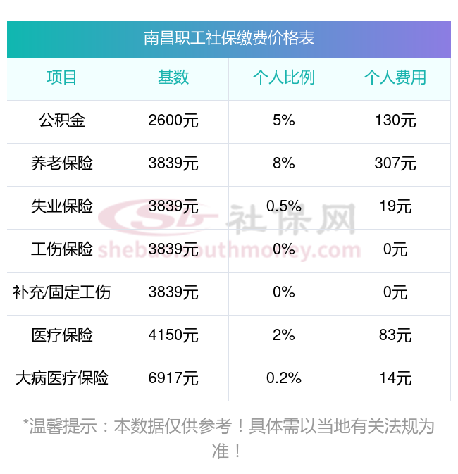 据新社通小编了解到,南昌职工社保缴费基数为:3839.00,个人费用约为:307.12元,企业费用约为:614.24元。