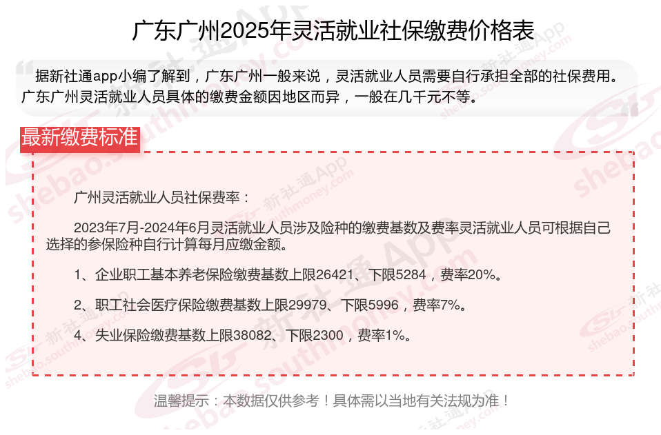 灵活就业社保能抵御疾病、失业、养老等重大风险,避免陷入经济困境。也能享受医保报销、养老金增长等红利。社保是劳动者的法定权利,断缴可能影响购房、落户、子女教育等。接下来随社保君了解一下2025年广东广州灵活就业人员社保交多少钱,2025年广东广州灵活就业社保缴费标准的详细内容。