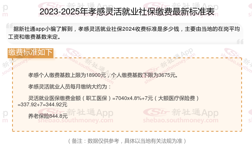 2025年孝感灵活就业人员社保交多少钱,你了解2025年孝感灵活就业人员社保缴费基数及比例吗,据新社通小编了解到,灵活就业社保缴费标准每年都会有所调整,主要体现在缴费基数和缴费比例上。接下来随新社通APP小编一起来看看。