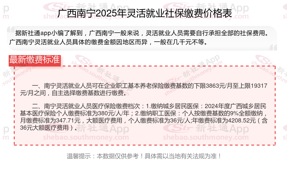 三、2025年广西南宁灵活就业社保缴费标准,最新如下: