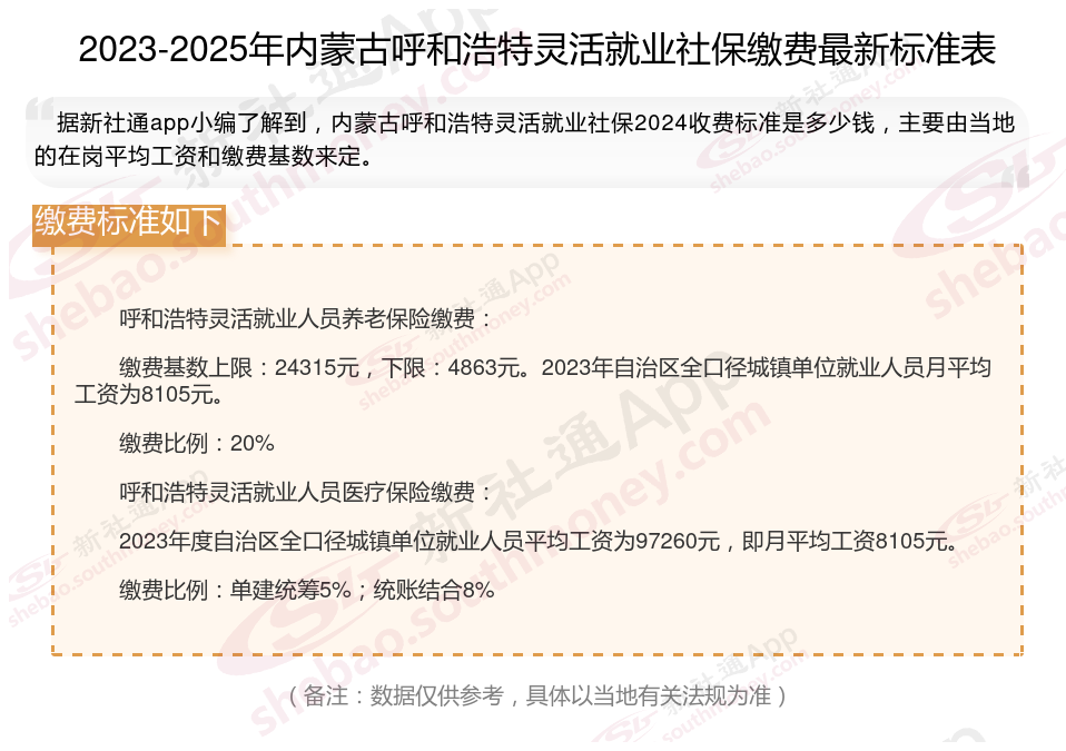 2025年内蒙古呼和浩特灵活就业人员社保交多少钱,你了解2025年内蒙古呼和浩特灵活就业人员社保缴费基数及比例吗,据新社通小编了解到,灵活就业社保缴费标准每年都会有所调整,主要体现在缴费基数和缴费比例上。接下来随新社通APP小编一起来看看。