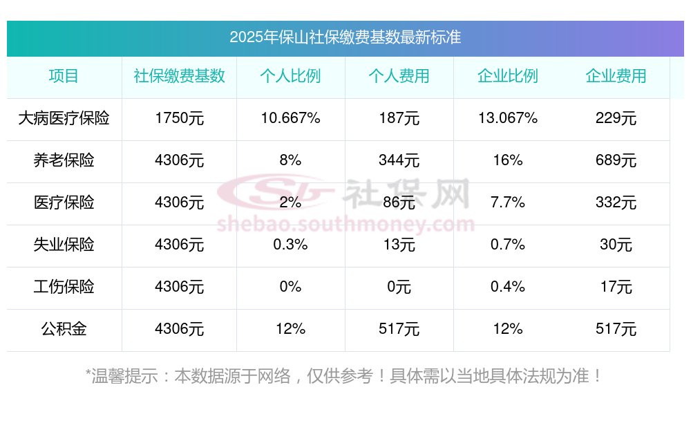 保山社保缴费最新多少钱一个月?保山社保缴费价格最新公布。2025保山职工社保年缴费金额=社保月缴费基数*社保比例*12个月。需要提醒的,各地的社保缴费基数和比例是不一样的,因此,社保每年要交多少钱也是因地而异的。
