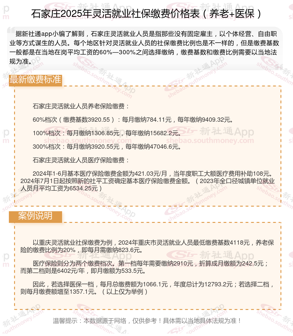 石家庄灵活就业社保2025年收费标准是多少钱,主要由当地的在岗平均工资和缴费基数来定。其次,灵活就业社保缴纳跟职工缴纳不同的地方在于,灵活就业社保参保只能参保养老保险和医疗保险,且缴纳比例完全由个人承担。另外,灵活就业人员社保参保选择,可自由选择参保城镇职工社保和城乡居民保险。2025年石家庄灵活就业社保缴多少钱?如何缴纳?怎么计算待遇?新社通APP小编将在下文为您详细说明。