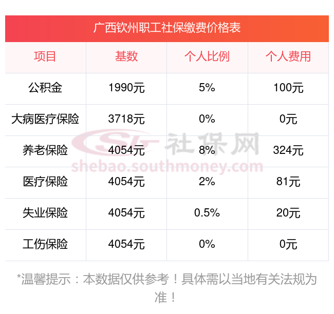 据新社通app显示,广西钦州社保缴费基数2025年标准,(社保最低一个月要交多少钱)广西钦州社保费用如下: