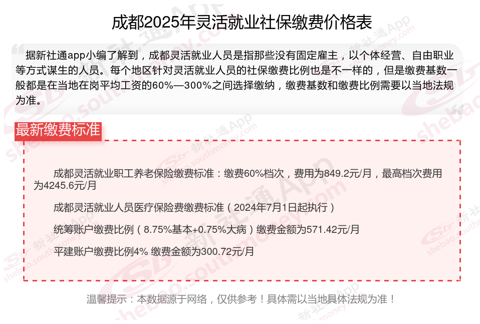 灵活就业社保通常只需缴纳养老和医疗两项(部分地区可自愿选缴失业险),其他险种无需强制缴纳。灵活就业社保缴费满15年后,退休后可领取养老金,避免老年无收入来源。那么2025年成都灵活就业人员社保需要交多少钱?下面随新社通小编一起来看看。