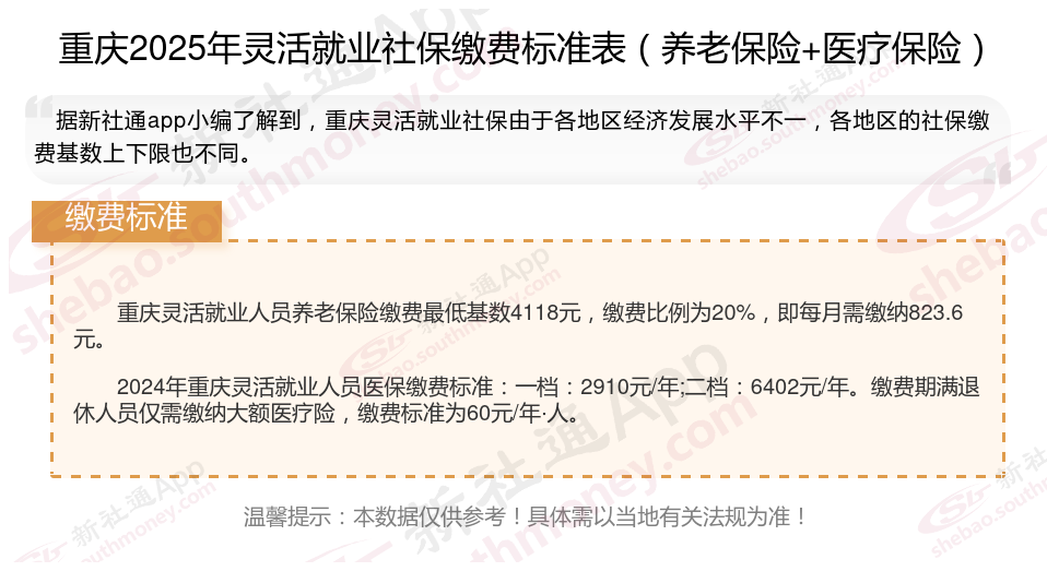灵活就业社保缴费标准每年都会有所调整,主要体现在缴费基数和缴费比例上。接下来随社保君了解一下2025年重庆灵活就业人员社保缴费标准是怎样的的相关内容。