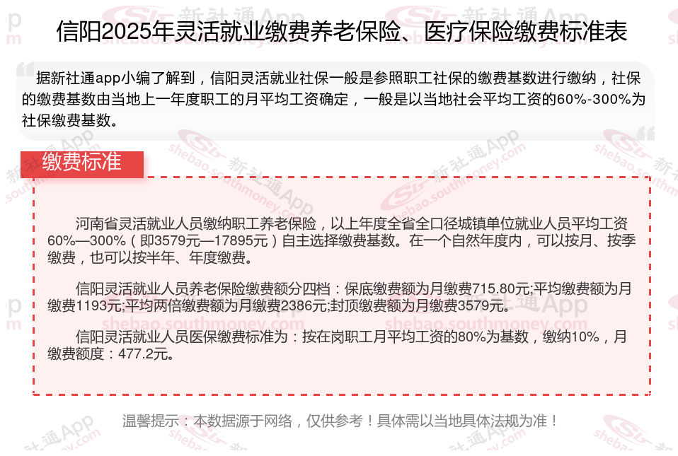 一、2025年信阳灵活就业社保缴费标准表 2025年信阳灵活就业社保多少钱一个月?
