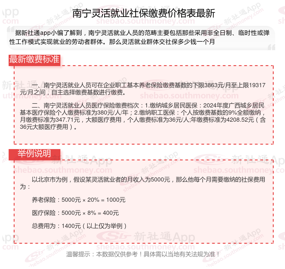 一、2024年南宁灵活就业社保缴费标准表 南宁灵活就业社保多少钱一个月?