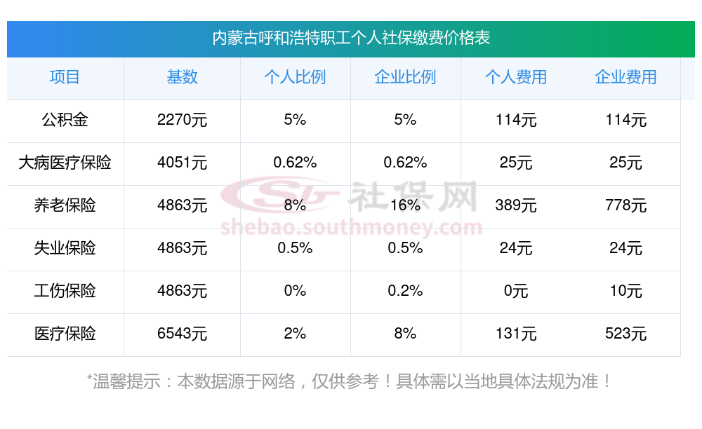 内蒙古呼和浩特职工社保缴费多少钱?内蒙古呼和浩特职工社保缴费基数最新参考为:3579.00,具体如下: