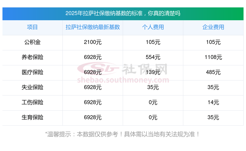 社保(社会保险)是公民基本生活和社会福利而建立的一种强制性社保制,旨在通过社会共济的方式,分担个人在养老、医疗、失业、工伤、生育等方面的风险。据新社通小编了解,拉萨社保养老保险基数为:6927.60。那么一个月需要缴纳多少钱?跟着新社通小编一起来了解一下2025年拉萨社保缴费详情。