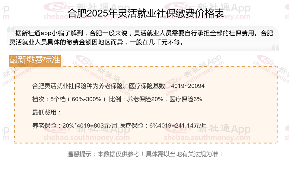 灵活就业社保缴费标准每年都会有所调整,主要体现在缴费基数和缴费比例上。接下来随社保君了解一下2025年合肥灵活就业人员社保缴费标准是怎样的的相关内容。