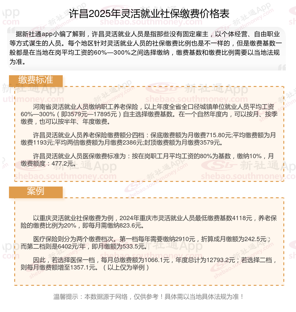 随着经济社会的不断发展,灵活就业群体不断地日益壮大,其社保缴费问题也愈发受到关注。那么2025年许昌灵活就业人员社保交多少钱,你了解2025年许昌灵活就业人员社保缴费基数及比例吗,接下来随新社通APP小编一起来看看。