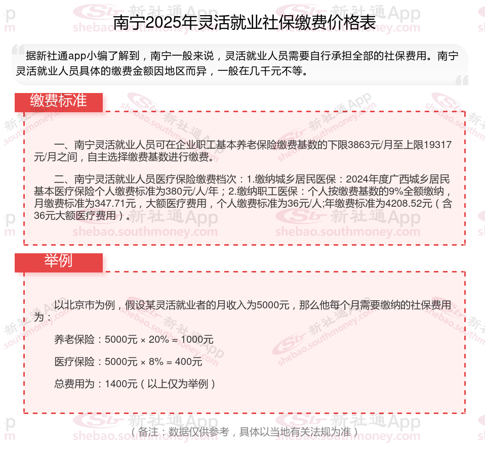 随着经济社会的不断发展,灵活就业群体不断地日益壮大,其社保缴费问题也愈发受到关注。那么2025年南宁灵活就业人员社保交多少钱,你了解2025年南宁灵活就业人员社保缴费基数及比例吗,接下来随新社通APP小编一起来看看。