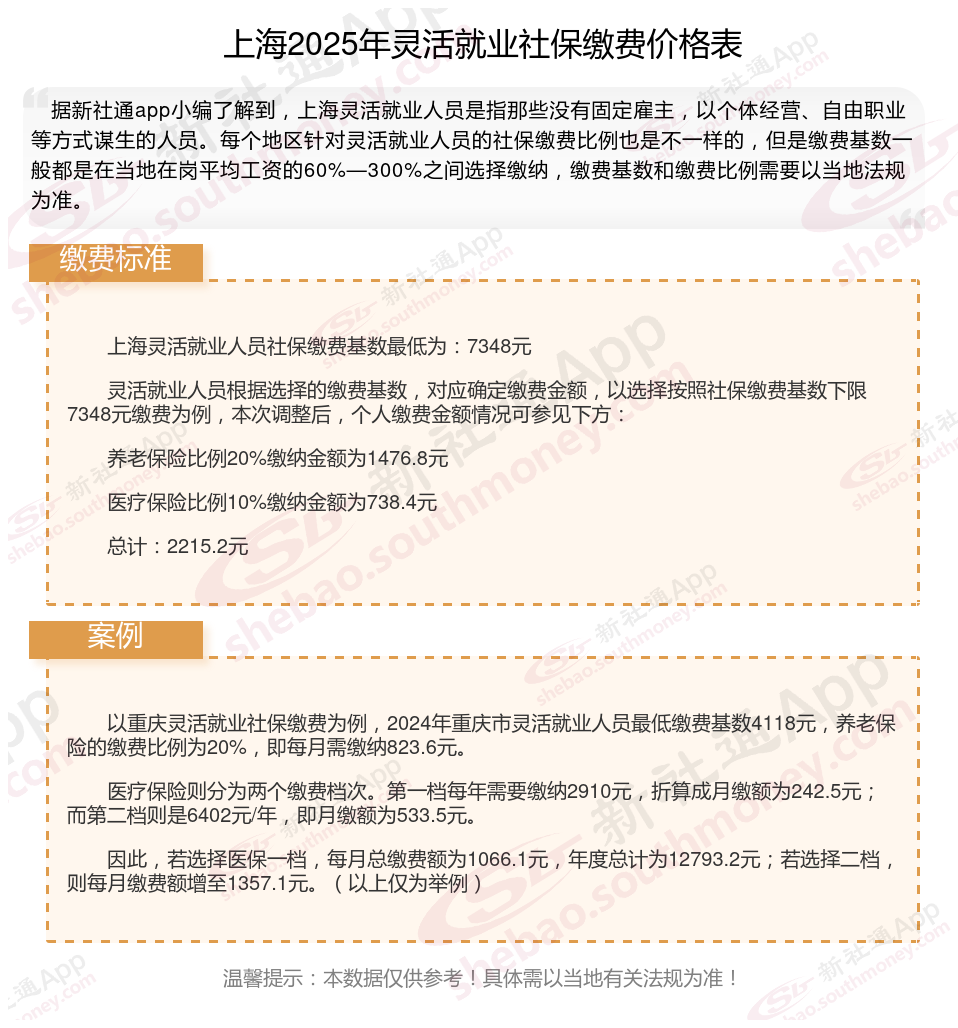 提示:上海灵活就业人员每个月的缴费压力还是比较大的,每个月的社保费用都是千元,缴费档次越高,灵活就业人员要缴纳的费用也越多。
