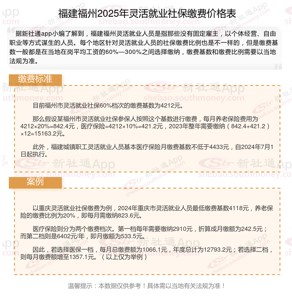 2025年福建福州灵活就业人员社保交多少钱,你了解2025年福建福州灵活就业人员社保缴费基数及比例吗,据新社通小编了解到,灵活就业社保缴费标准每年都会有所调整,主要体现在缴费基数和缴费比例上。接下来随新社通APP小编一起来看看。