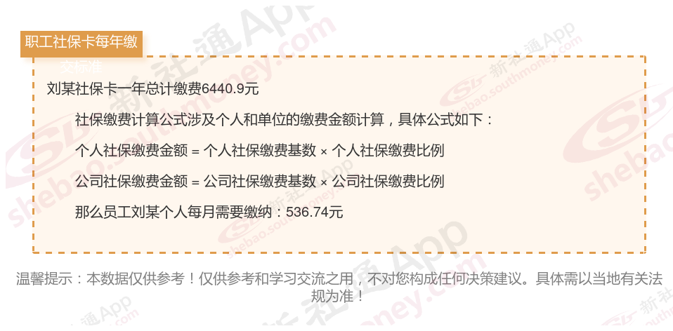 由上图得知,刘某社保卡一年需要缴纳6440.9元,个人部分每月需要缴纳536.74元,若您想要了解明细点击新社通社保计算器,来了解一下明细吧。