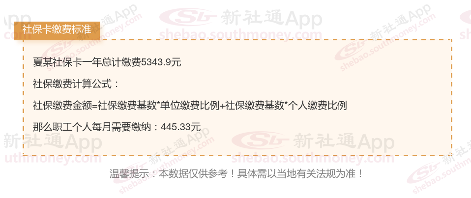 由上图得知,夏某社保卡一年需要缴纳5343.9元,职工个人月缴纳445.33元,若您想要了解明细点击新社通社保计算器,来了解一下明细吧。
