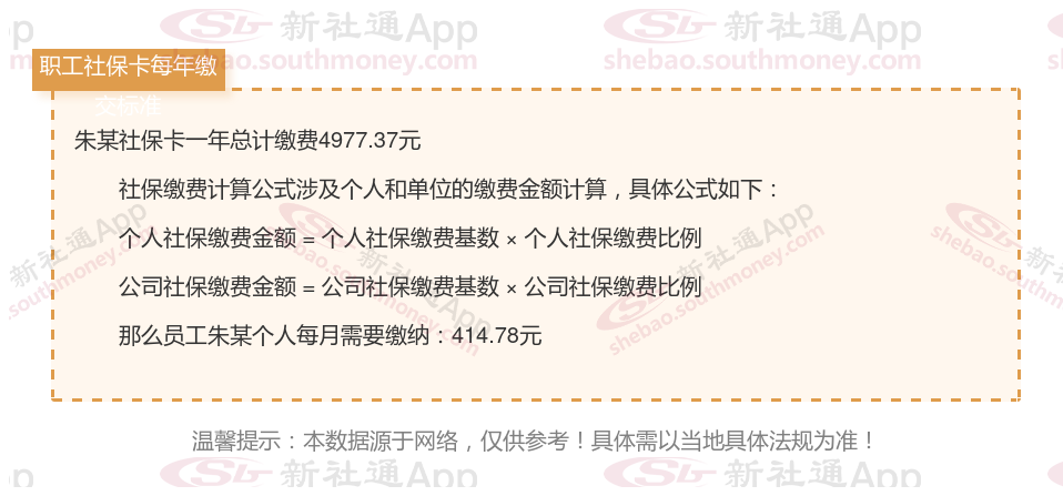 由上图得知,朱某社保卡一年需要缴纳4977.37元,个人部分每月需要缴纳414.78元,若您想要了解明细点击新社通社保计算器,来了解一下明细吧。