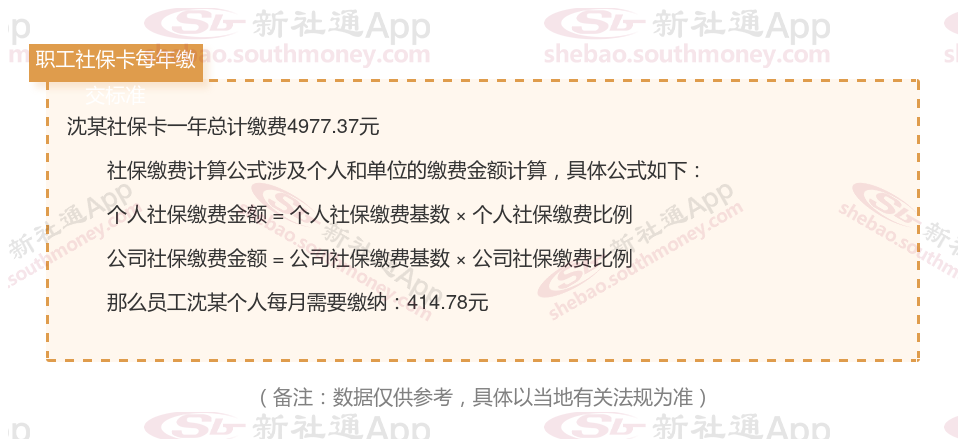 由上图得知,沈某社保卡一年需要缴纳4977.37元,个人部分每月需要缴纳414.78元,若您想要了解明细点击新社通社保计算器,来了解一下明细吧。