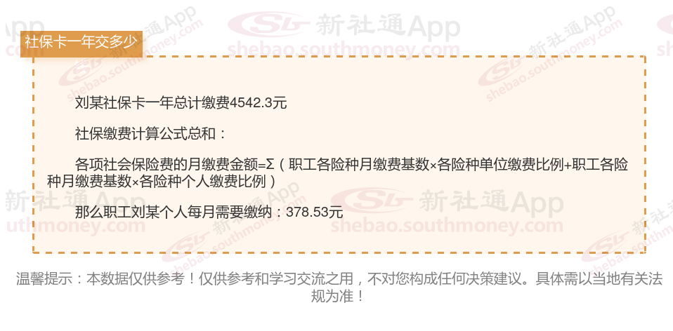 由上图得知,刘某社保卡一年需要缴纳4542.3元,职工个人月缴纳378.53元,若您想要了解明细点击新社通社保计算器,来了解一下明细吧。