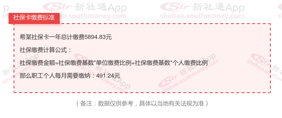 由上图得知,希某社保卡一年需要缴纳5894.83元,职工个人月缴纳491.24元,若您想要了解明细点击新社通社保计算器,来了解一下明细吧。