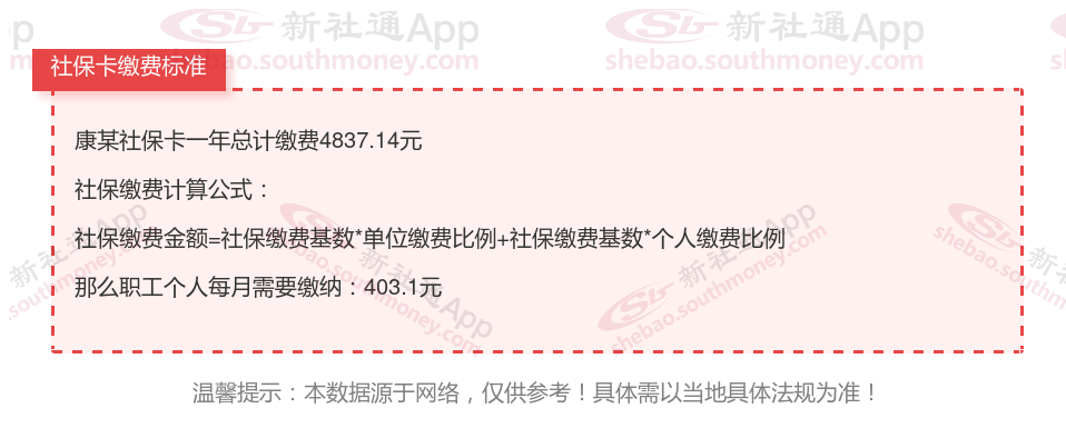 由上图得知,康某社保卡一年需要缴纳4837.14元,职工个人月缴纳403.1元,若您想要了解明细点击新社通社保计算器,来了解一下明细吧。