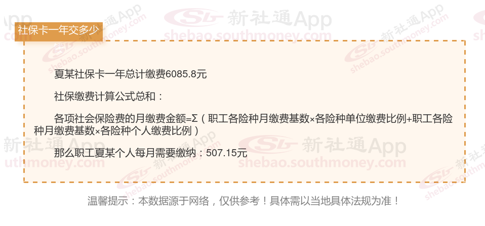 由上图得知,夏某社保卡一年需要缴纳6085.8元,个人部分每月需要缴纳507.15元,若您想要了解明细点击新社通社保计算器,来了解一下明细吧。