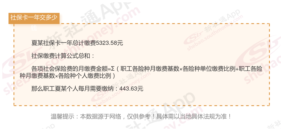 由上图得知,夏某社保卡一年需要缴纳5323.58元,个人部分每月需要缴纳443.63元,若您想要了解明细点击新社通社保计算器,来了解一下明细吧。