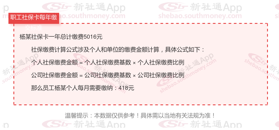由上图得知,杨某社保卡一年需要缴纳5016元,职工个人月缴纳418元,若您想要了解明细点击新社通社保计算器,来了解一下明细吧。