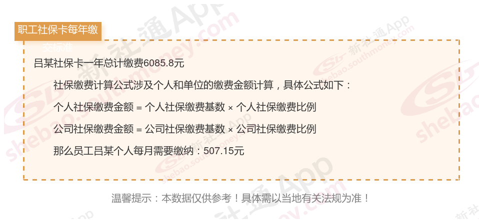 由上图得知,吕某社保卡一年需要缴纳6085.8元,个人部分每月需要缴纳507.15元,若您想要了解明细点击新社通社保计算器,来了解一下明细吧。