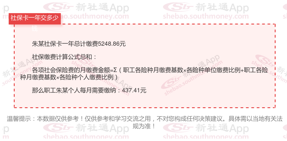 由上图得知,朱某社保卡一年需要缴纳5248.86元,职工个人月缴纳437.41元,若您想要了解明细点击新社通社保计算器,来了解一下明细吧。
