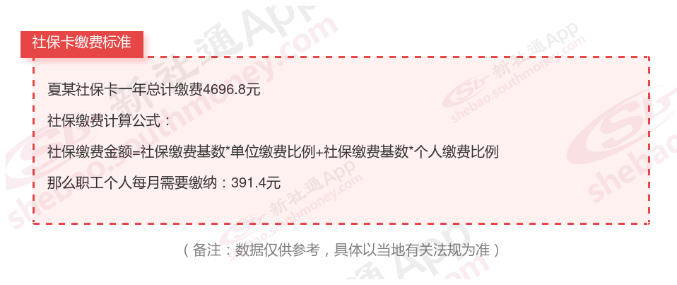 由上图得知,夏某社保卡一年需要缴纳4696.8元,个人部分每月需要缴纳391.4元,若您想要了解明细点击新社通社保计算器,来了解一下明细吧。