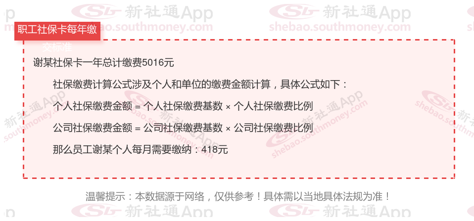 由上图得知,谢某社保卡一年需要缴纳5016元,个人部分每月需要缴纳418元,若您想要了解明细点击新社通社保计算器,来了解一下明细吧。