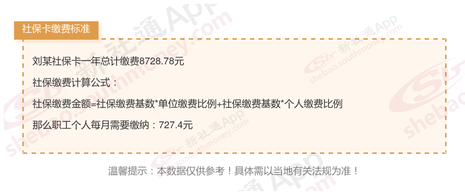 由上图得知,刘某社保卡一年需要缴纳8728.78元,职工个人月缴纳727.4元,若您想要了解明细点击新社通社保计算器,来了解一下明细吧。
