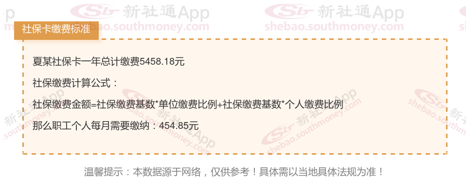 由上图得知,夏某社保卡一年需要缴纳5458.18元,个人部分每月需要缴纳454.85元,若您想要了解明细点击新社通社保计算器,来了解一下明细吧。