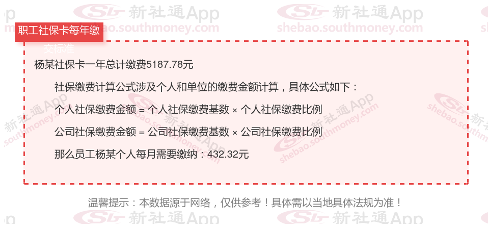 由上图得知,杨某社保卡一年需要缴纳5187.78元,个人部分每月需要缴纳432.32元,若您想要了解明细点击新社通社保计算器,来了解一下明细吧。