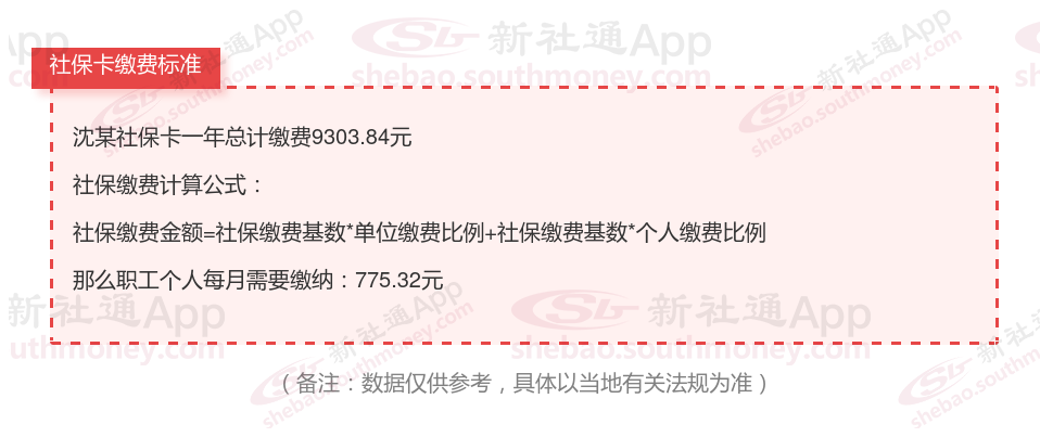 由上图得知,沈某社保卡一年需要缴纳9303.84元,个人部分每月需要缴纳775.32元,若您想要了解明细点击新社通社保计算器,来了解一下明细吧。
