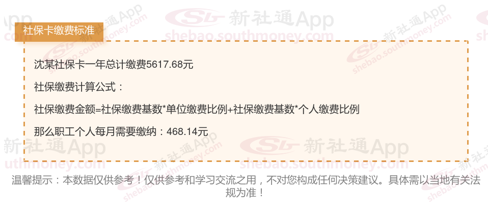 由上图得知,沈某社保卡一年需要缴纳5617.68元,职工个人月缴纳468.14元,若您想要了解明细点击新社通社保计算器,来了解一下明细吧。