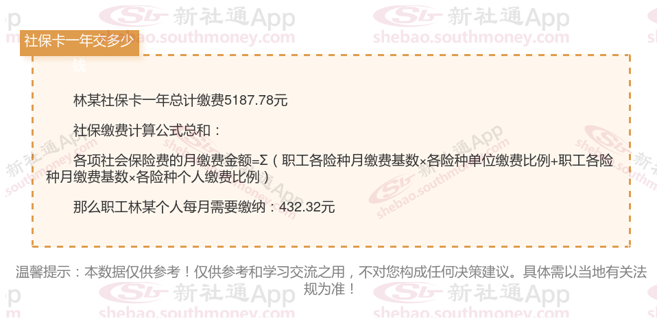 由上图得知,林某社保卡一年需要缴纳5187.78元,职工个人月缴纳432.32元,若您想要了解明细点击新社通社保计算器,来了解一下明细吧。