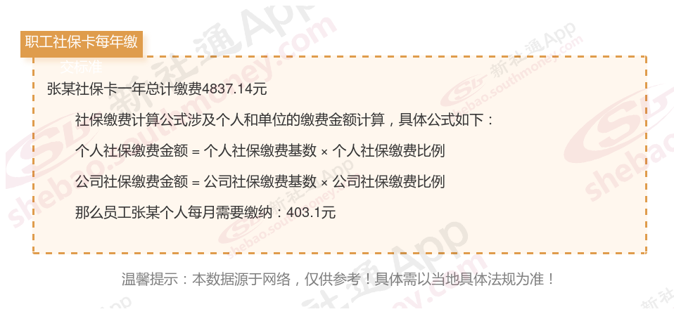由上图得知,张某社保卡一年需要缴纳4837.14元,个人部分每月需要缴纳403.1元,若您想要了解明细点击新社通社保计算器,来了解一下明细吧。