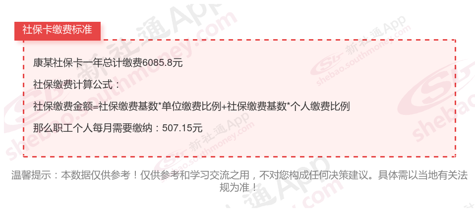 由上图得知,康某社保卡一年需要缴纳6085.8元,职工个人月缴纳507.15元,若您想要了解明细点击新社通社保计算器,来了解一下明细吧。