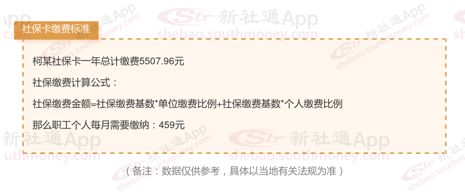 由上图得知,柯某社保卡一年需要缴纳5507.96元,职工个人月缴纳459元,若您想要了解明细点击新社通社保计算器,来了解一下明细吧。