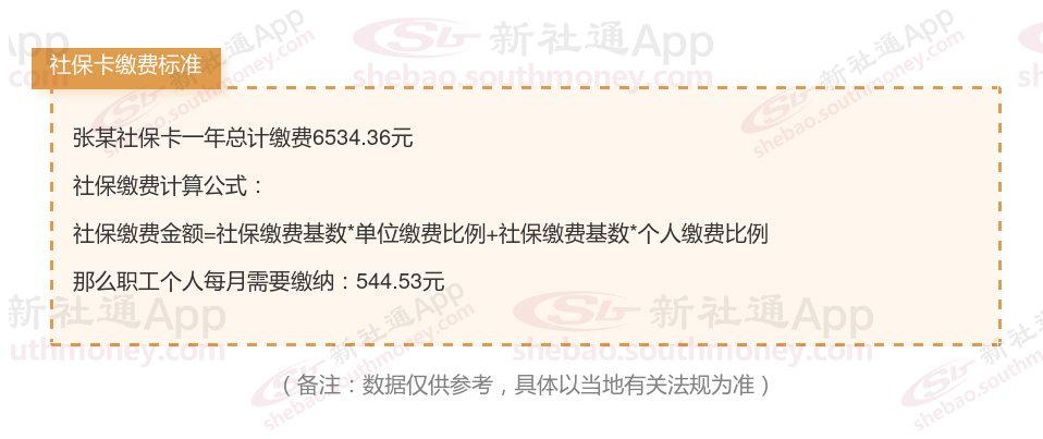 由上图得知,张某社保卡一年需要缴纳6534.36元,职工个人月缴纳544.53元,若您想要了解明细点击新社通社保计算器,来了解一下明细吧。